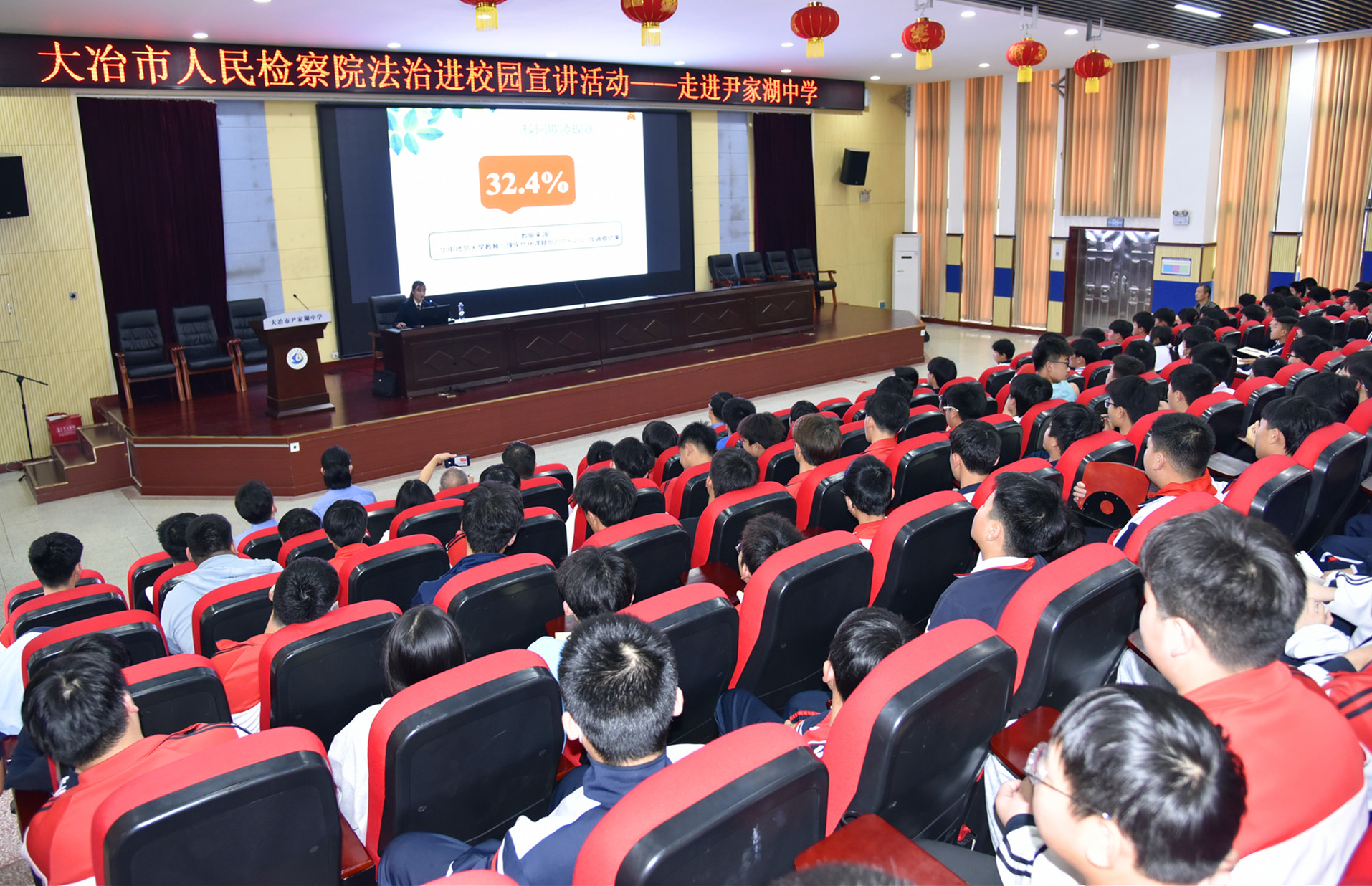 本网讯(通讯员 刘家云)5月12日,大冶市人民检察院法治进校园宣讲活动走进辖区内的尹家湖中学,向该校3个年级70个班的200余名学生代表宣讲主题为“抵制校园欺凌,守护少年的你”法治宣传教育。这是该院今年以来第11次走进中小学校园开展类似活动,也是该院全方位推进市域治理工作的一项重要内容。